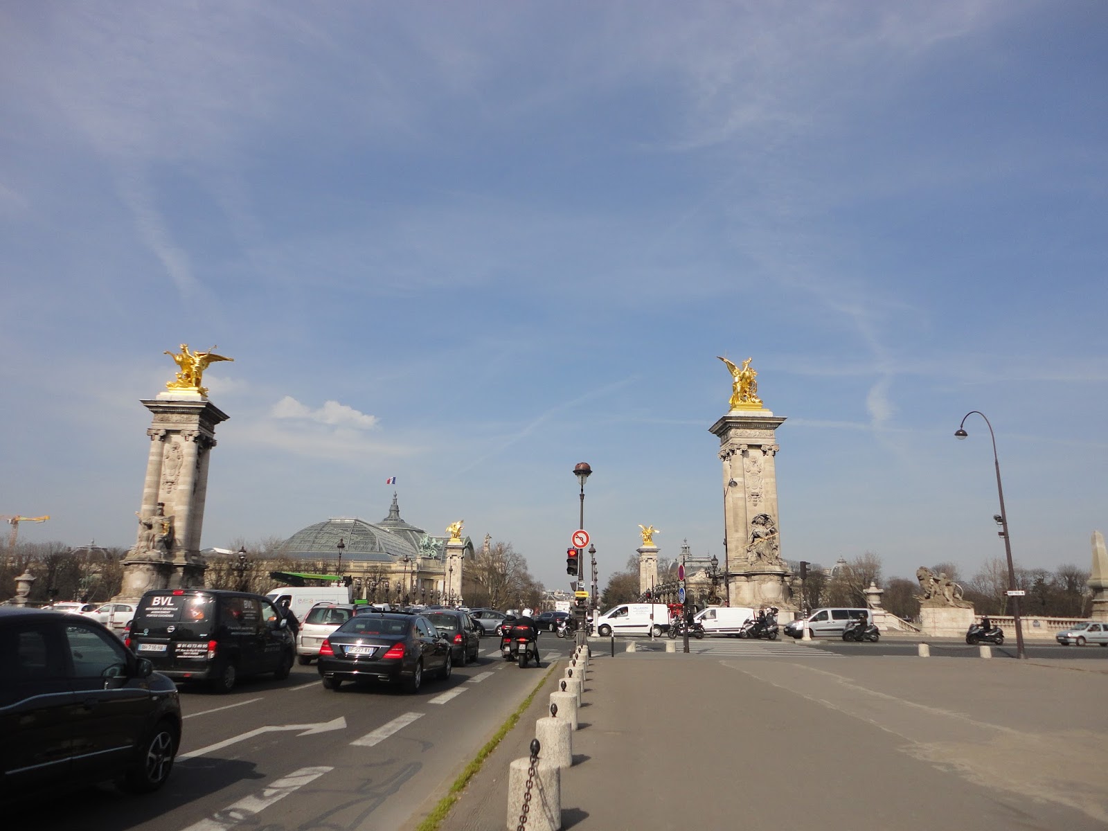 A ponte liga a Esplanade des Invalides com o Grand e o Petit Palais, na outra margem do Rio Sena.